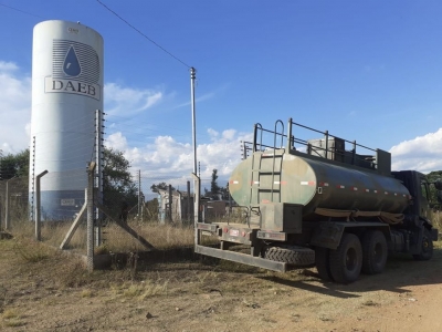 São seis caminhões do exército e um do Daeb. Todas as pipas são abastecidas na ETA, mantendo a qualidade da água que diariamente passa pelo processo de tratamento e por análises. As cisternas são esterilizadas.