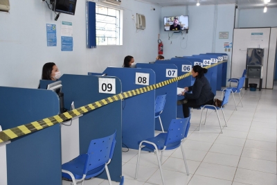 Funcionários estão na porta controlando o fluxo de entrada e retirando a senha no totem. Estas pessoas também disponibilizam o álcool gel para cada contribuinte que chega para ser atendido. Além disso, foi colocada uma faixa para limitar o distanciamento entre os atendentes e o público.